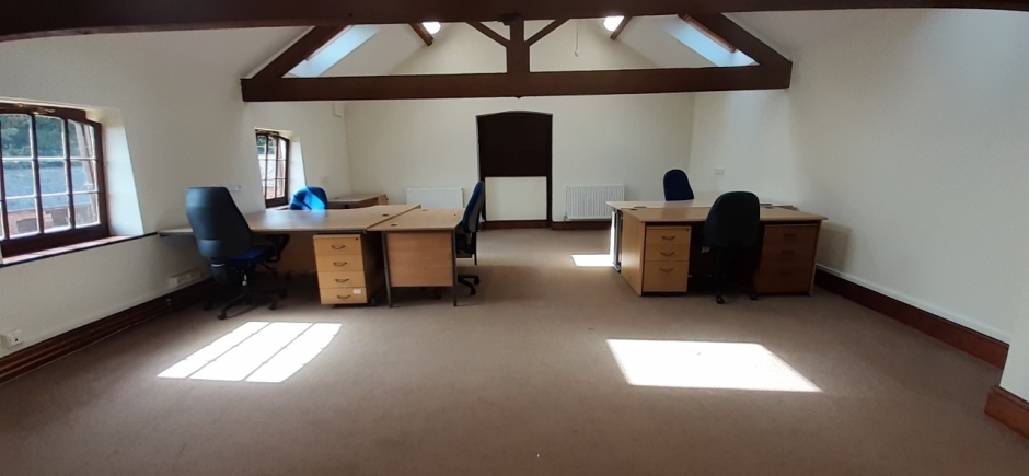 The subject office comprises first floor accommodation within a shared building. The office is of open plan configuration and has character features such as exposed beams